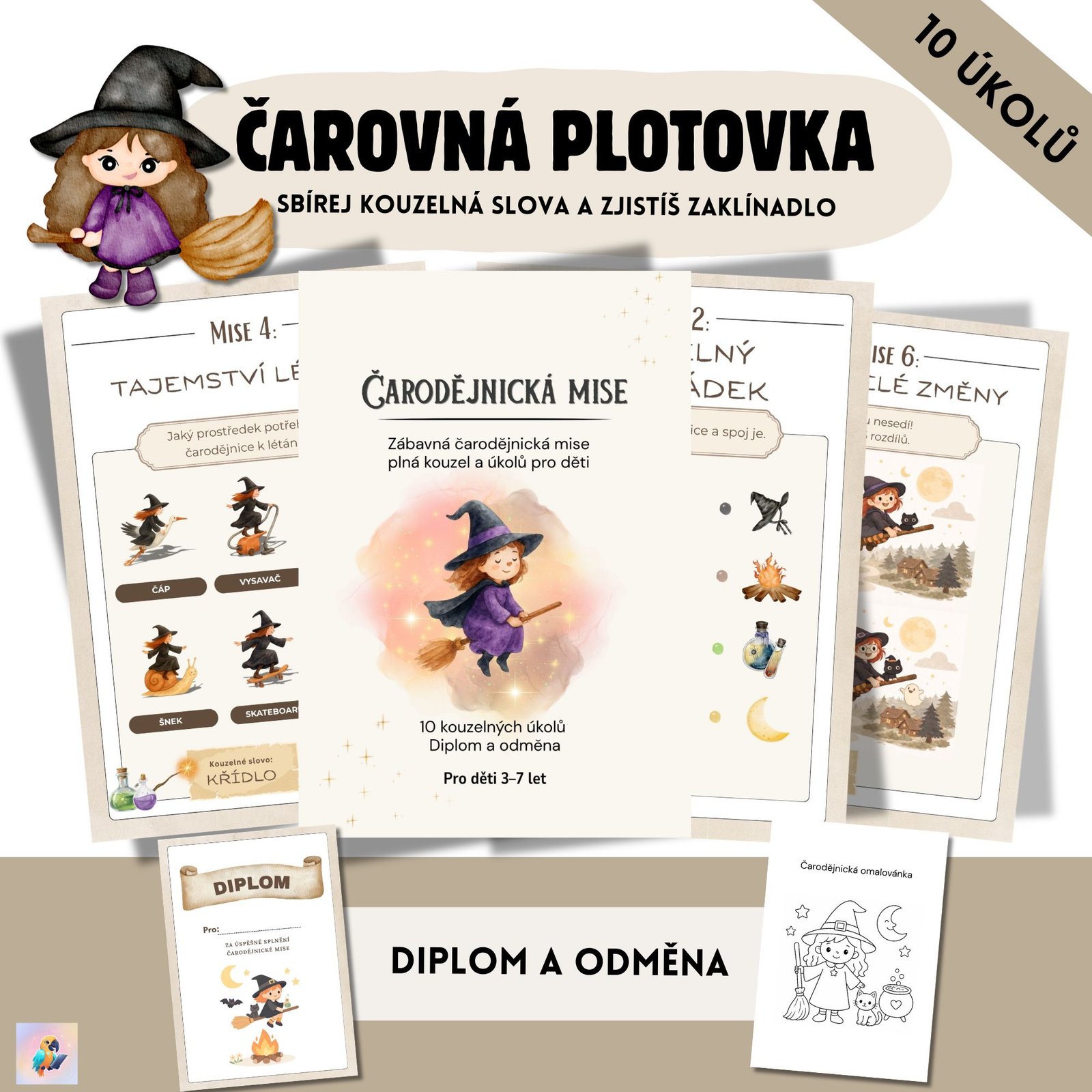 Čarodějnická mise pro děti (3–7 let) – stezka s úkoly + diplom